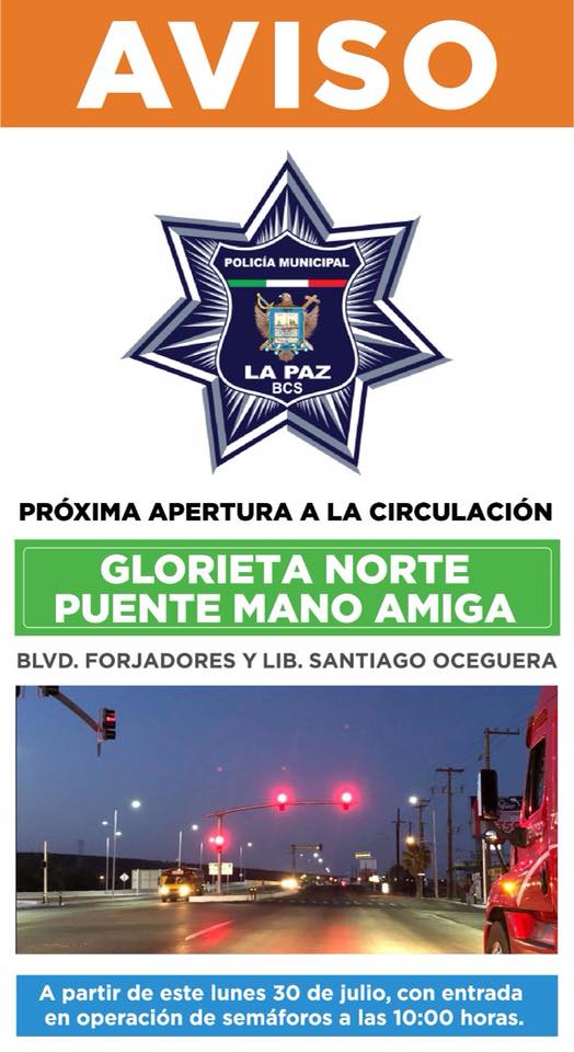 La Dirección General de Seguridad Pública, Policía Preventiva y Tránsito Municipal de La Paz comunica a los automovilistas y demás usuarios de la vía pública, la apertura a la circulación la glorieta norte ubicada en Boulevard Forjadores y LibramientoSantiago Oceguera, la cual quedara habilitada a partir del día lunes 30 de julio.