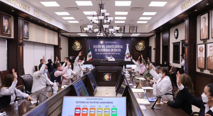 “Baja California Sur, continúa registrando contagios por Covid 19. Se tienen altos niveles de hospitalización y además, no bajan los índices de fallecimientos; por lo que permanecen en el nivel 5 del Sistema Estatal de Alertas Sanitarias los municipios de: Mulegé, Loreto, Comondú y La Paz; mientras que Los Cabos, continúa en el nivel 4”; dijo el Gobernador, Carlos Mendoza Davis; al encabezar la sesión del trabajo del Comité Estatal de Seguridad en Salud.