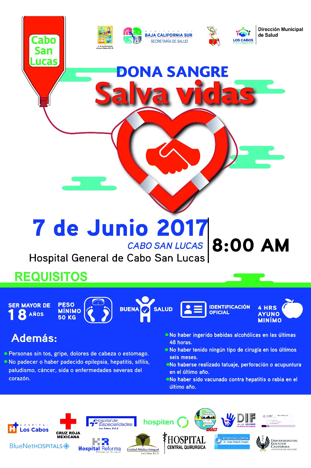 “Dona Sangra, Salva Vidas”, es el lema de la Campaña de Donación de Sangre, que emprenderá el Ayuntamiento de los Cabos, a través de la Dirección Municipal de Salud, el próximo 7 de junio, desde las 8 de la mañana, en las instalaciones del Hospital General de la Delegación Municipal de Cabo San Lucas.