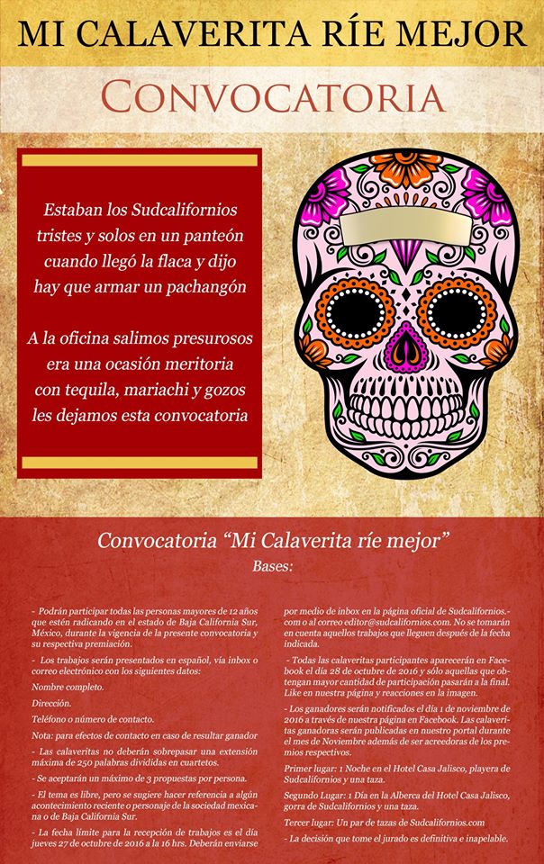 A fin de mantener nuestras bellas tradiciones a partir del día 20 de noviembre, y hasta las fechas indicadas a continuación, hacemos la amena invitación a todos los sudcalifornios residentes del Estado de Baja California Sur a participar en nuestro primer concurso “Mi calaverita ríe mejor”