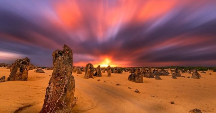 Ahora bien, existen pequeños rincones en el mundo donde las condiciones geológicas, el clima y el paisaje, parecen darse la mano para crear un escenario único y deslumbrante, casi tan espectacular como en nuestra atesorada y mítica Sudcalifornia. ¿Otro ejemplo?: Si hablamos de desiertos y el que hoy nos puede asombrar con sus imágenes es el Desierto de los Pináculos, en la enigmática y siempre sorprendente Australia. El Desierto de los Pináculos o Pinnacles Desert en inglés, que se encuentra cerca de la ciudad de Cervantes en la provincia de Australia Occidental. Es un sitio donde desde lejos se pueden divisar un enorme banco de arena y de dunas contenidas dentro del Parque Nacional Nambung que ofrece un panorama poco usual, ya que numerosos pináculos de roca caliza emergen entre la fragilidad de la arena con formas irregulares, alcanzando entre tres y siete metros de altura como si fueran los últimos guardianas de esa tierra lejana, casi pre-histórica y a la vez futurista, según el ángulo y el espíritu con el que lo miremos este paisaje tan extraño y a la vez tan atrayente para el visitante.