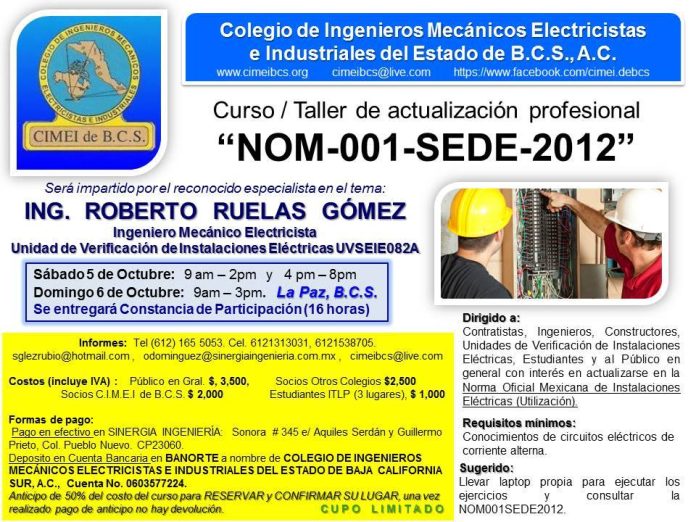 Me es grato comentar que el Colegio de Ingenieros Mecánicos Electricistas e Industriales del Estado de Baja California Sur A.C., www.cimeibcs.org, https://www.facebook.com/cimei.debcs/, está organizando un curso de actualización profesional referente al tema de la entrada en vigor de la NOM001SEDE2012.