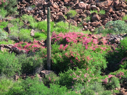 La hermosa enredadera San miguelito (Antigonon Leptopus) es una planta trepadora muy común en todo el estado de Baja California Sur. Por su extenso hábitat, que llega hasta Centroamérica, es conocida con diversos nombres. Es muy evidente en los periodos de lluvias pues embellece el paisaje con multitud de flores de color principalmente lila en racimos que se montan sobre todo árbol, arbusto y cactácea que crece cerca.