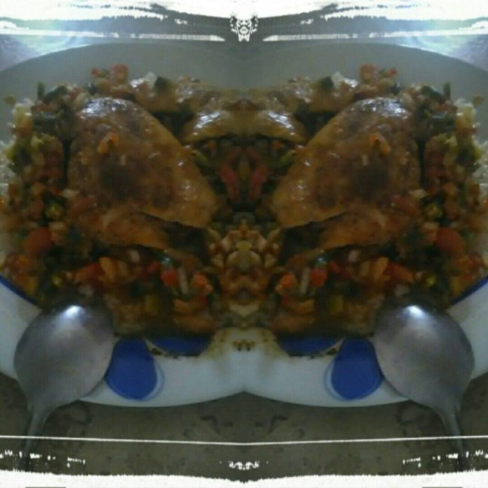 Puedes colocar el arroz sobre un plato como una cama y encima vacías el contenido del papel aluminio, de manera que el pescado quede arriba de la mezcla de verduras y que el jugo caiga sobre el arroz.