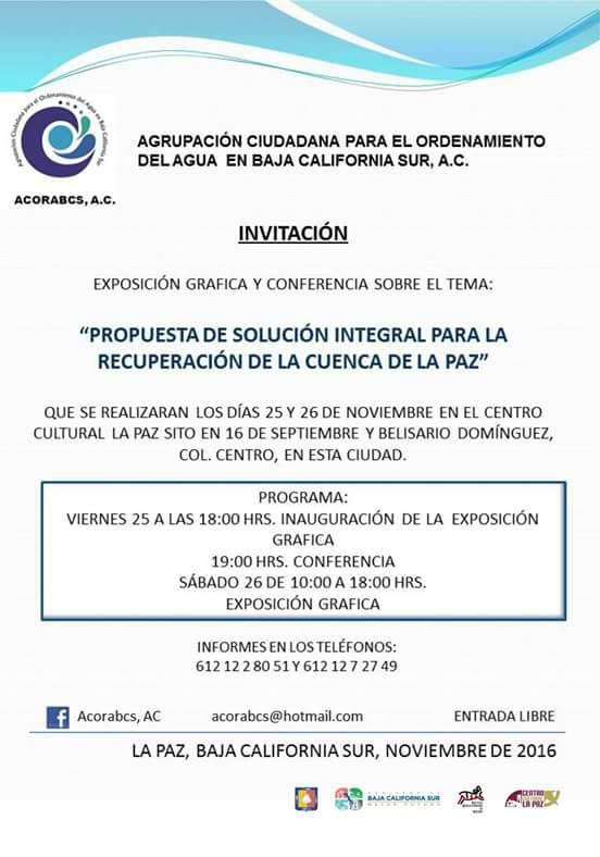 La Agrupación Ciudadana para el Ordenamiento del Agua en Baja California Sur invita a la exposición gráfica y conferencia “Propuesta de solución integral para la recuperación de la cuenca de La Paz” el próximo viernes 25 de noviembre.
