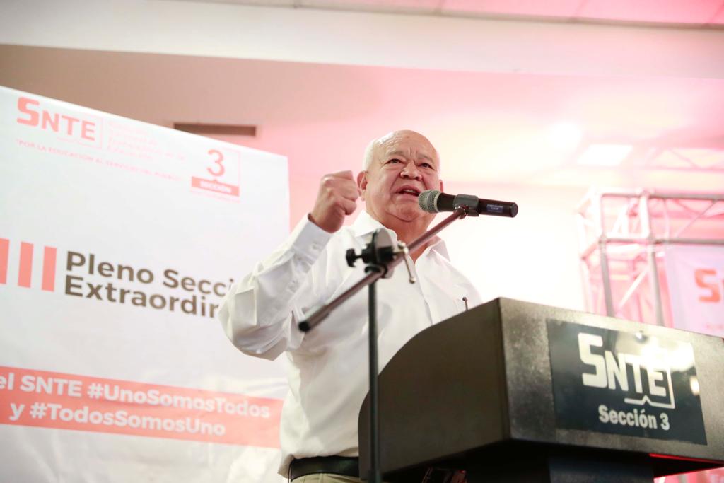 Flanqueado por el Secretario General del Sindicato Nacional de Trabajadores de la Educación (SNTE), Alfonso Cepeda Salas; de autoridades de los tres niveles de Gobierno, Fuerzas Armadas y la Secretaria de Educación, Alicia Meza; el Mandatario, inauguró el VIII Pleno Seccional Extraordinario de la Sección III del Sindicato Nacional de Trabajadores de la Educación (SNTE).