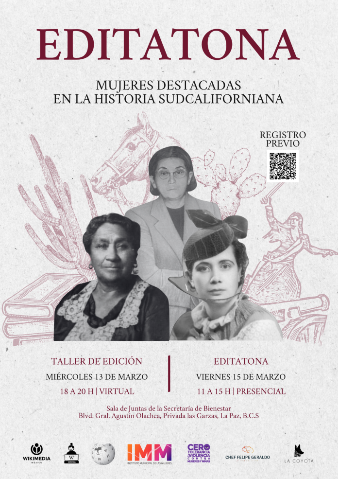 En la historia de nuestra bella capital de La Paz, BCS, han sido muchas las mujeres sudcalifornianas que han destacado en los múltiples ámbitos sociales y han aportado para el crecimiento de nuestra cultura y tradiciones, pero lo que no se nombra o visibiliza no existe, es por esto que el Instituto Municipal de La Mujer el marco del mes de la mujer, invita a conmemorar y visibilizar el legado de las mujeres que han marcado nuestra historia. Participando en este evento colaborativo junto a Wikimedia México para inmortalizar sus logros en Wikipedia.
