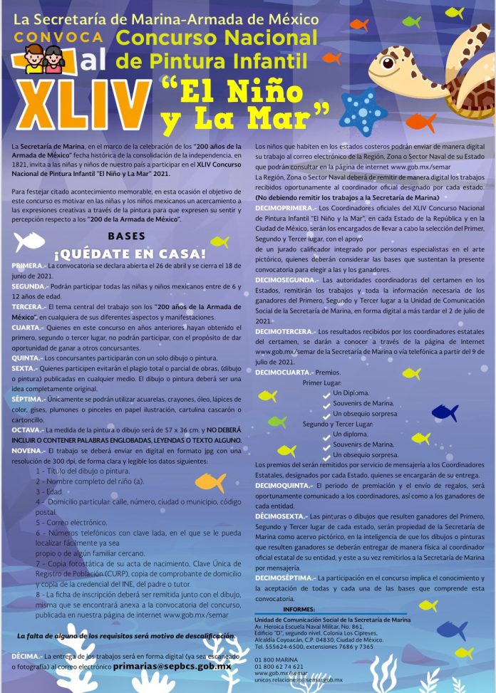 La Secretaría de Marina lanzó la convocatoria para la edición 44, del Certamen Nacional de Pintura Infantil “El Niño y la Mar”; el cual, cierra el próximo 18 de junio; llevando como lema: “Quédate en Casa”: El evento, se lleva a cabo en el marco de la celebración de los 200 años de la Armada de México; anticipó el Coordinador de Servicios Culturales de la Secretaría de Educación Pública del Estado, Simón Mendoza García.