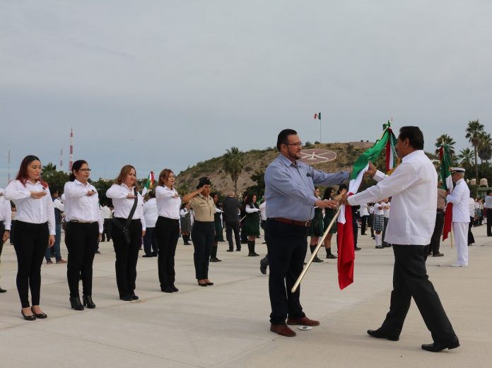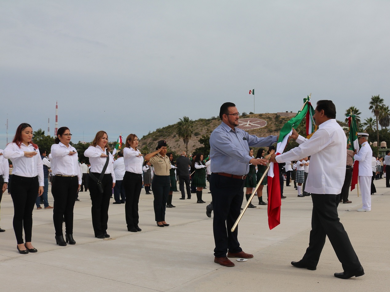En la ceremonia, a la que acudieron autoridades: civiles, militares y escoltas de escuelas de las diversas zonas escolares; comentó que al recibir la bandera, los directores de cada institución educativa, asumen el compromiso de rendir honores, con respeto, todos los lunes y en fechas cívicas; a nuestra bandera.