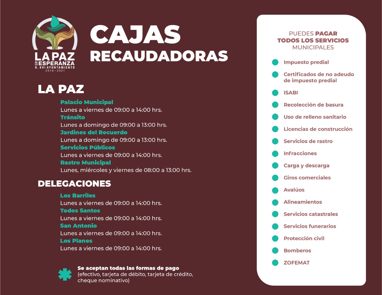 Trabajan de lunes a domingo, en horarios, de 09:00, hasta las 13:00 horas; mientras que, en la Dirección de Servicios Públicos, el horario es hasta las 14:00 horas, todos los días y, en el Rastro Municipal, sólo los días lunes, miércoles y viernes; desde las 08:00 hasta las 13:00 horas. En las delegaciones municipales, de: Los Barriles, Todos Santos, San Antonio y Los Planes; abren de lunes a viernes, desde las 09:00 hasta las 14:00 horas. Si bien, en las cajas recaudadoras se aceptan todas las formas de pago y se pueden pagar todos los servicios municipales; también la Tesorería Municipal, cuenta con el pago en línea, para mayor comodidad de los contribuyentes; en ésta modalidad, están disponibles los pagos del: impuesto predial, infracciones de tránsito y el ISABI en línea. Lo anterior, gracias a las peticiones presentadas por las distintas agrupaciones colegiadas y sectores empresariales; para que, el XVI Ayuntamiento de La Paz, abriera una serie de trámites en línea, que se relacionan, entre otras; a la actividad catastral, las cuales han permitido tener actividad económica que requiere de la apertura de estas cajas recaudadoras.