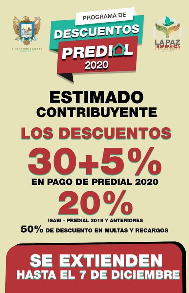En apoyo a las molestias que generaron las condiciones climatológicas y las recientes lluvias, imposibilitando, por algunos días, el servicio para el pago de las contribuciones municipales; el XVI Ayuntamiento de La Paz, amplió el plazo de pago hasta el 7 de diciembre de 2019, del descuento del 30 por ciento, más 5 adicional, para el ejercicio fiscal 2020.