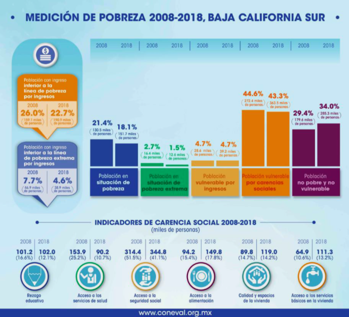 Baja California Sur, ocupa el segundo lugar nacional con el menor índice de pobreza, de acuerdo al Consejo Nacional de Evaluación de la Política de Desarrollo Social (CONEVAL), cifra dada a conocer en su informe sobre la medición de la pobreza multidimensional en México, serie 2008–2018, lo que traduce que 23 mil 900 sudcalifornianos, dejaron de vivir en condiciones precarias; destacó el gobernador, Carlos Mendoza Davis.
