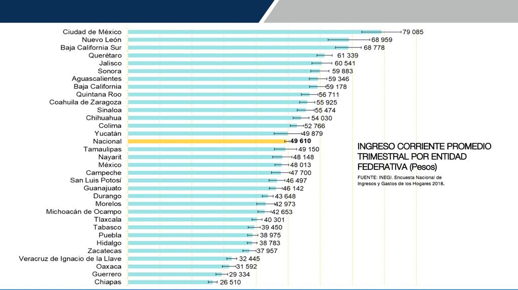 La más reciente Encuesta Nacional de Ingresos y Gastos de los Hogares 2018, llevada a cabo por el Instituto Nacional de Estadística y Geografía (INEGI), reconoció a Baja California Sur, como la tercera entidad, en el país, con el mayor ingreso corriente promedio trimestral por hogar, con 68 mil 778 pesos; destacó el gobernador Carlos Mendoza Davis.
