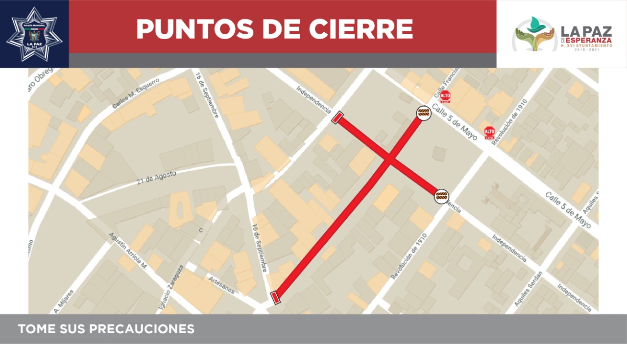 La Dirección General de Seguridad Pública, Policía Preventiva y Tránsito Municipal de La Paz, informa a los usuarios de la vía pública, ciudadanía y público en general, que por motivo del Tradicional “Tianguis Madero 2018”, se realizará el cierre a la circulación en zonas del Centro Histórico de la Capital del Estado.