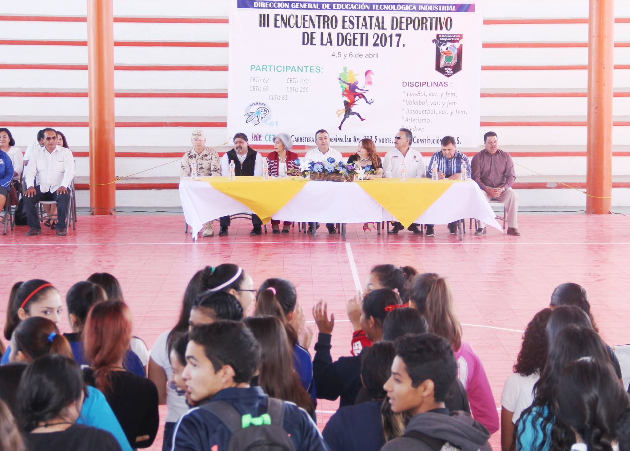 Instalados en la Cancha de la Unidad Deportiva “Famanía”, de Ciudad Constitución; dio la bienvenida a los representantes de las Direcciones Generales de Estudios Tecnológicos e Industriales del Estado; de autoridades civiles y militares y de la Educación Superior Tecnológica de Comondú y aseguró que su Gobierno trabaja para ofrecer a los jóvenes, espacios dignos, al contar, con un gran avance en infraestructura deportiva.