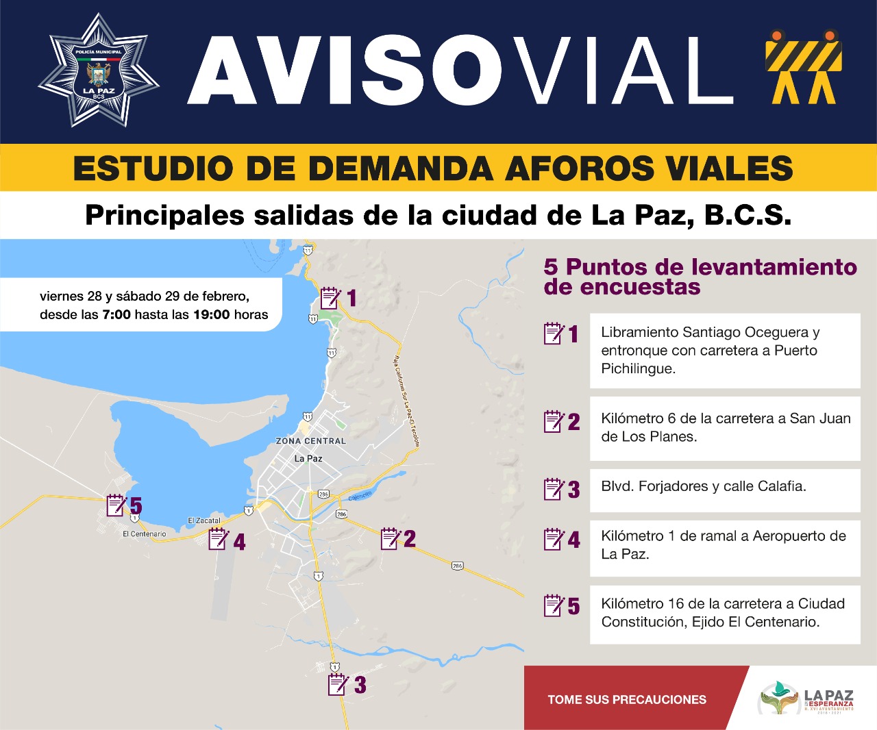 La Dirección General de Seguridad Pública, Policía Preventiva y Tránsito Municipal de La Paz, hace del conocimiento de la población en general que, del miércoles 26 de febrero, al viernes 6 de marzo del presente año, se estará realizando el: “Estudio de demanda, relacionado con los aforos viales, esperados del proyecto de construcción del Libramiento Sur-Poniente, con conexión al acceso sur de la ciudad de La Paz, B.C.S.