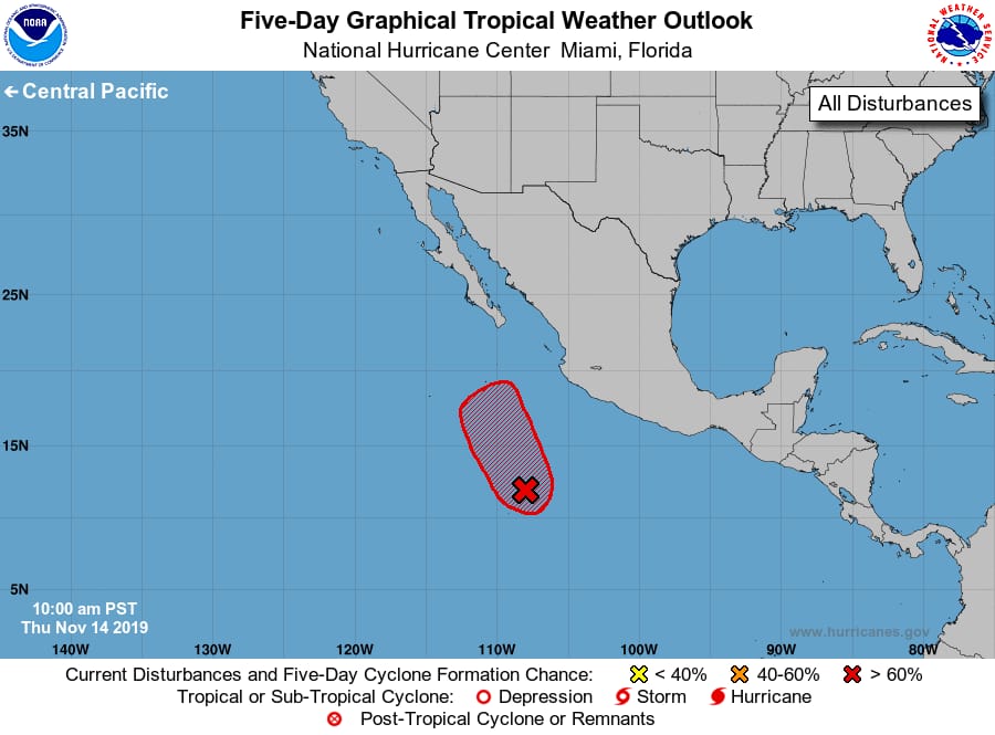 “Al sur de Cabo San Lucas, hay un sistema de baja presión bien definida, con potencial para la formación de una depresión tropical, el próximo fin de semana, mientras el sistema se mueve lento hacia el norte, con una probabilidad alta del 90 por ciento, para ciclón tropical en 24 a 48 horas”; expresó el Subsecretario.