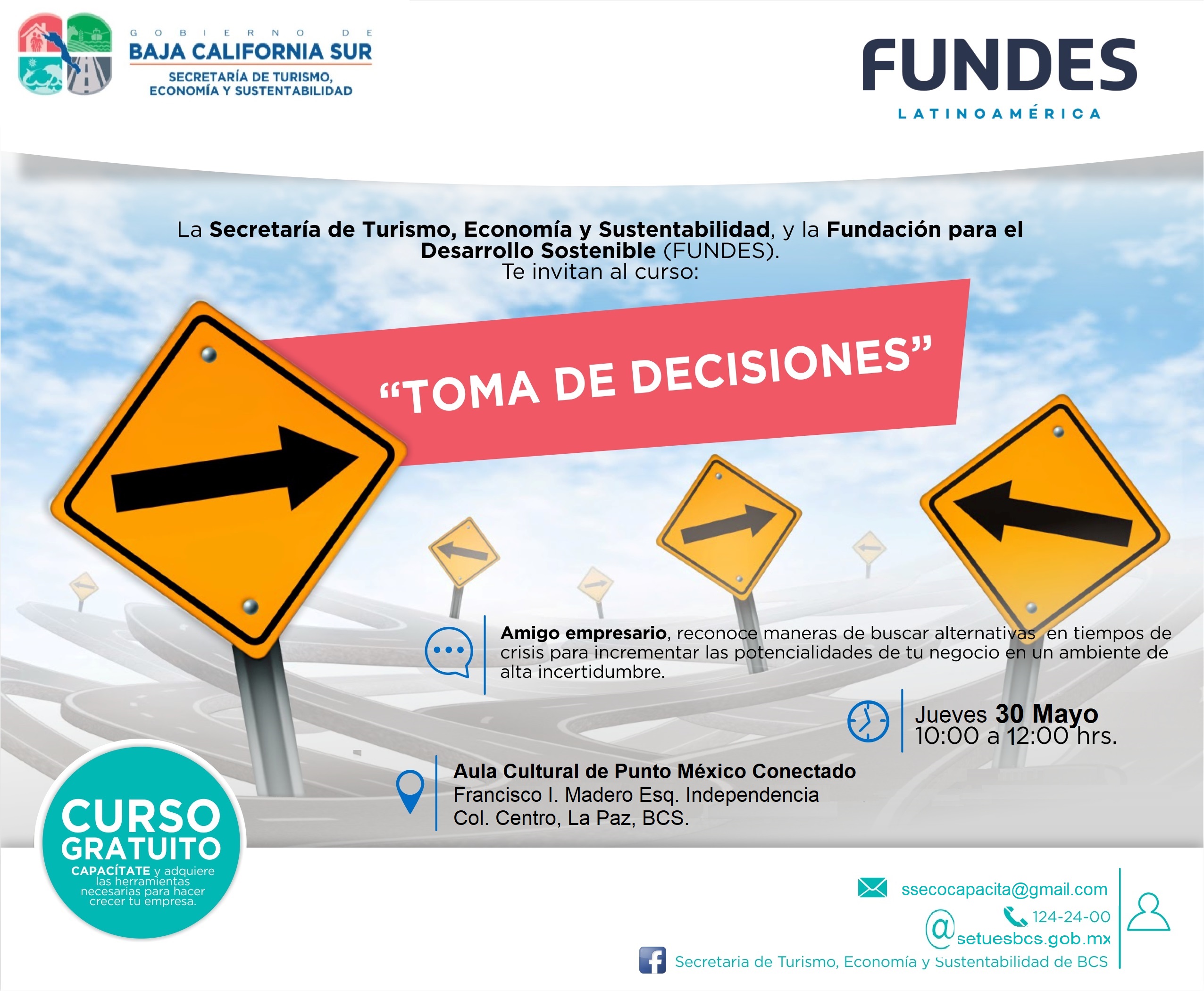 Con el objetivo de contribuir al fortalecimiento y consolidación de los negocios, la Secretaría de Turismo, Economía y Sustentabilidad (SETUES), en coordinación con la Fundación para el Desarrollo Sostenible (FUNDES); brindará el curso: “Toma de Decisiones”.