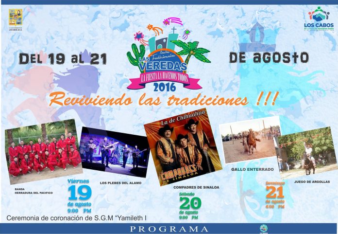 Como una encomienda del Presidente Municipal de Los Cabos, Arturo De la Rosa Escalante, mantener vivas las tradiciones de las delegaciones, subdelegaciones y comunidades de Los Cabos que permitan fortalecer la identidad de los habitantes; el XII Ayuntamiento, invita a la ciudadanía sudcaliforniana, a las Fiestas Tradicionales de “Las Veredas 2016”, a desarrollarse en la Cancha Pública de la comunidad, de este 19 al 21 de agosto.