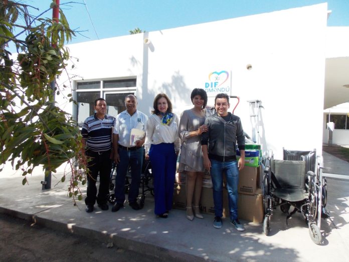 Entre los artículos que fueron recibidos por la presidenta de DIF se encuentran 110 paquetes de pañales para adulto, 4 asientos para baño, 3 sillas de ruedas, 1 par de muletas, 3 andadores manuelas de aluminio y 3 andaderas con frenos., teniendo como testigo al responsable de Trabajo Social de DIF Lic. Jesús González Ochoa.
