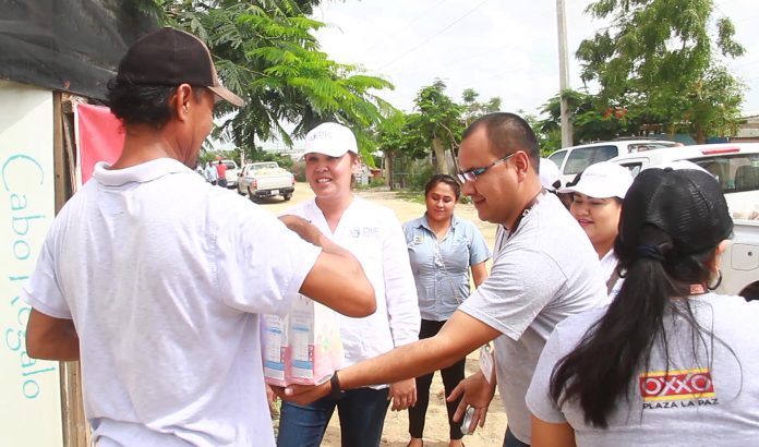 La Presidenta del Sistema Municipal DIF-Los Cabos, Vianey Núñez de De La Rosa y el Responsable de Operación de la Zona Sur, de la Cadena Comercial OXXO, Luis Miguel Araujo Martínez; entregaron víveres, recaudados por empleados de la cadena comercial, quienes aportaron y se ofrecieron a entregar la ayuda casa por casa, en beneficio de las familias afectadas por el paso de la Tormenta Tropical “Lidia”.