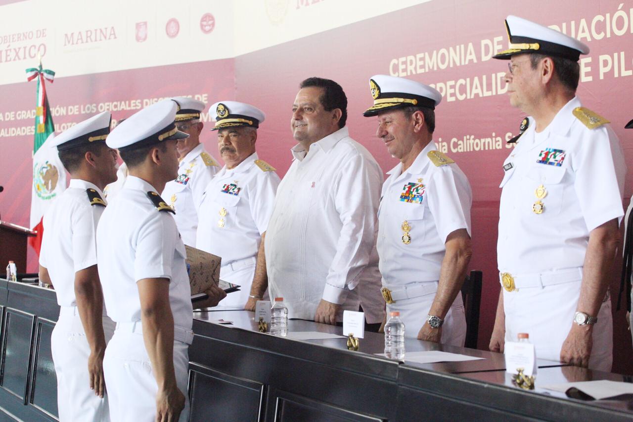 El mandatario sudcaliforniano, destacó la importancia que la Escuela de Aviación cumpla con la honrosa tarea de formar pilotos bajo un concepto que ha evolucionado, buscando alcanzar los más altos estándares educativos navales.