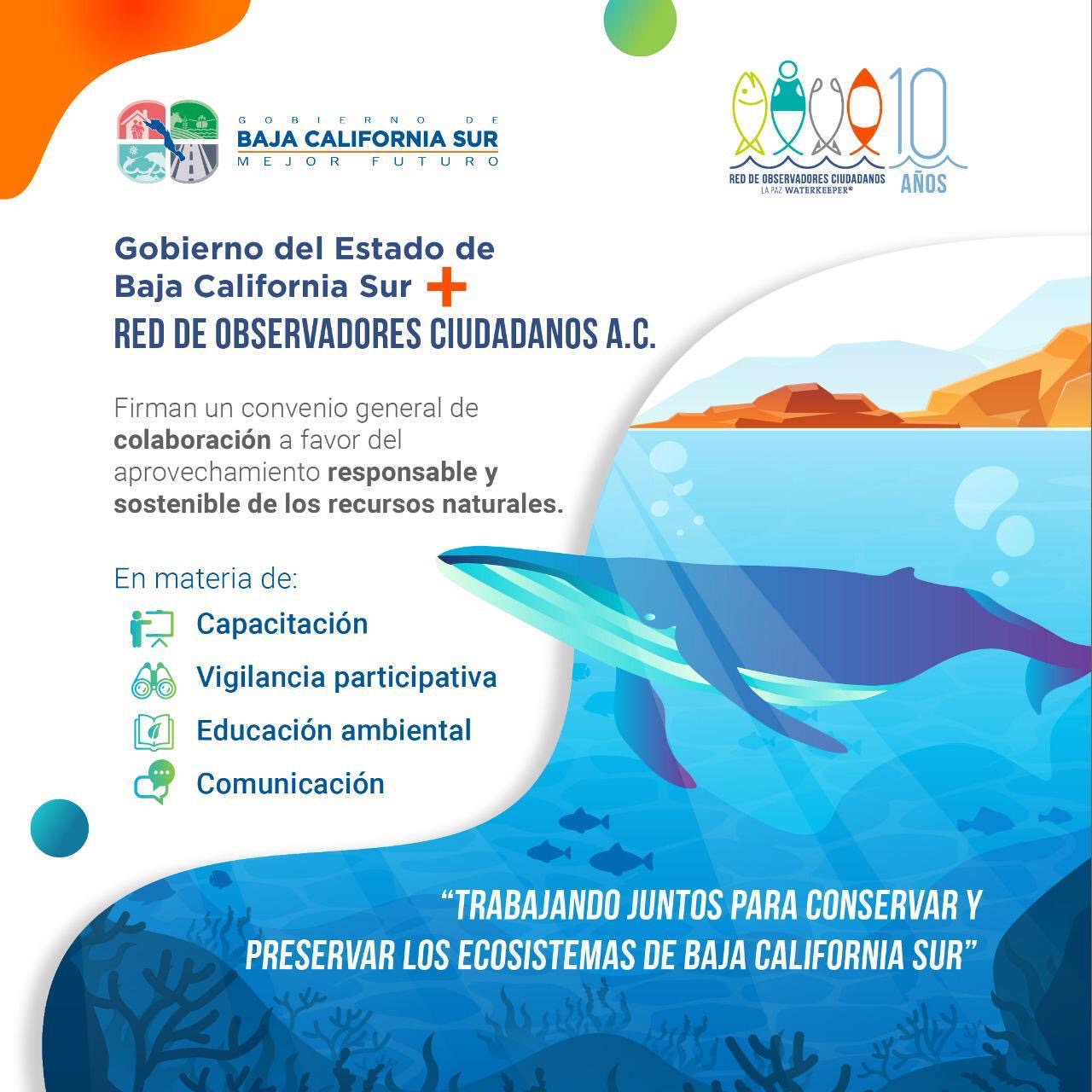 Dio a conocer la firma de un convenio de colaboración, entre el Gobierno del Estado y la Red de Observadores Ciudadanos A.C. (ROC); en materia de: vigilancia, capacitación y educación ambiental; así como para establecer vehículos de comunicación, en favor del aprovechamiento sostenible de los recursos naturales.
