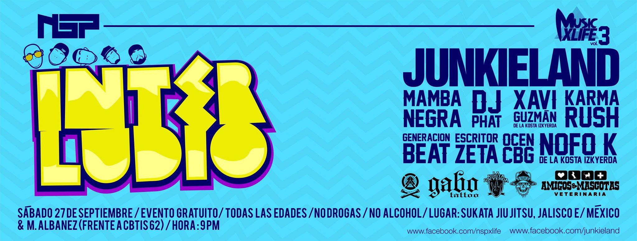 Este 27 de septiembre, en el Sukata Jiu Jitsu, se llevará a cabo el “Music x life 3” evento en el cual la Junkieland presentará su disco titulado”Interludio” junto a un gran elenco de artistas invitados. Desde Guadalajara “La mamba negra”, conocida también como Hispana, en las tornamesas Dj Phat, originario de Cabo San Lucas, desde Ensenada B.C. Xavi Guzmán, Ocen, THC Band y Ñofo k del colectivo la kosta izkierda, también asistirán artistas locales como Escritor Z y Generación Beat.