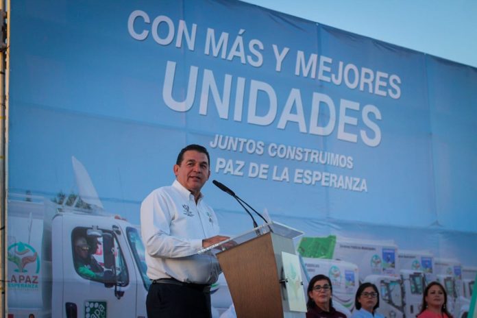 Flanqueado por el Presidente de la Mesa Directiva del Congreso del Estado, Diputado, Homero González Medrano; también presentó el Programa: “La Paz, Ciudad Limpia”, entregando más de 7 camiones nuevos recolectores de basura a los servicios públicos municipales y pipas cisterna para OOMSAPAS y Bomberos.