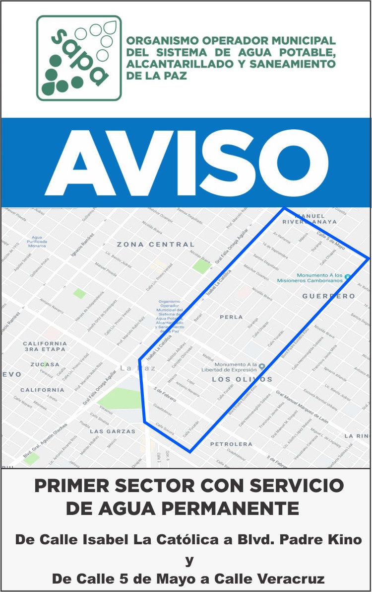 El Organismo Operador Municipal del Sistema de Agua Potable, Alcantarillado y Saneamiento de La Paz, informa que a partir de este 16 de mayo del 2018, se iniciaron los trabajos de automatización, del cuadrante, comprendido del Boulevard, Padre Kino a Isabel La Católica y de la calle 5 de Mayo, a la calle Veracruz, con la finalidad de ofrecer un suministro permanente en las colonias que comprenden esa demarcación, es decir; colonias con suministro 24 horas, los 365 días del año.