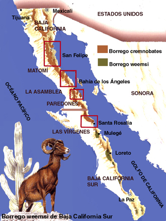 El Borrego Cimarrón es una especie endémica, vive en pequeños grupos donde la edad y el tamaño de los cuernos marca el estatus en sus manadas, su hábitat se caracteriza por climas desérticos, relieve topográfico intrincado, y vegetación escasa.