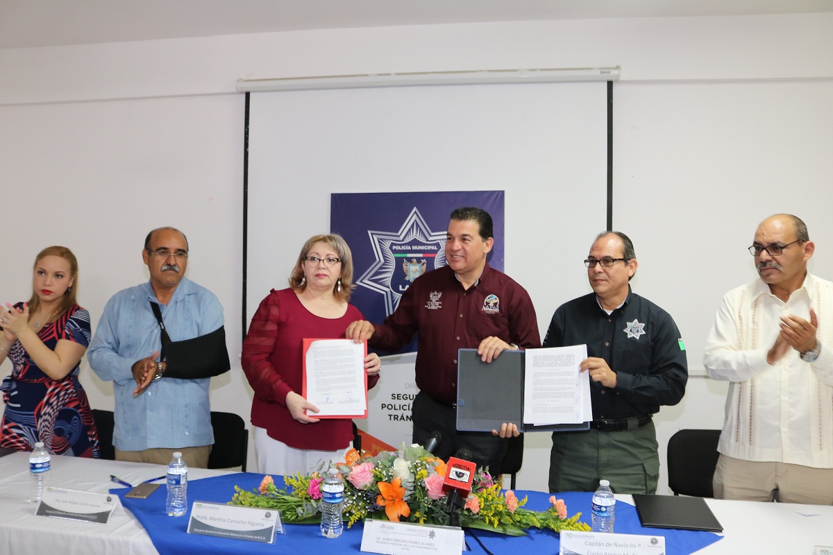 Con el propósito de contribuir al desarrollo profesional de los elementos de la policía municipal y administrativos de La Paz y abatir el rezago educativo, la Secretaría de Educación Pública (SEP), firmó convenio de colaboración con la Dirección de Seguridad y Tránsito Municipal de La Paz, para brindar el servicio de “preparatoria abierta”; señaló Martina Camacho Higuera, Directora de Educación Básica, al encabezar la firma.