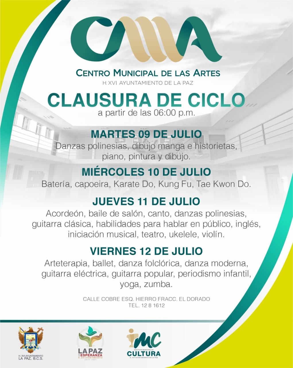 Del 9 al 12 de julio, el XVI Ayuntamiento de La Paz, a través del Instituto Municipal de Cultura, llevará a cabo los festivales de clausura de cursos del Centro Municipal de las Artes, espacio que tiene el objetivo de fomentar la educación artística en niños y jóvenes de distintas edades, con 50 talleres de iniciación cultural; impartidos por especialistas en el ámbito. El Director del Recinto, Raúl Cota Álvarez, reiteró que será los días 9, 10, 11 y 12 de julio, a partir de las 18:00 horas, cuando se lleven a cabo las presentaciones de los productos de los distintos cursos que se ofertaron en el ciclo enero-julio del presente año. Explicó que, las actividades inician el día martes , con la presentación de danzas polinesias, exposición de dibujo manga e historietas, piano, pintura y dibujo.