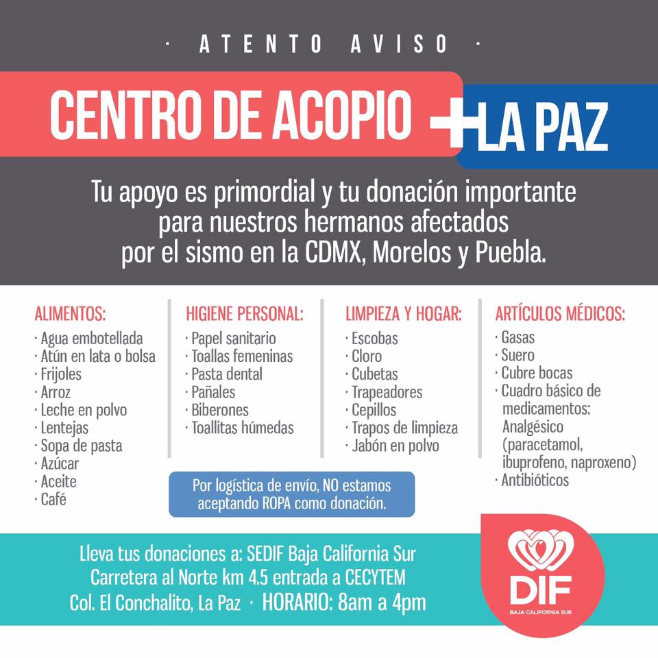 La Directora del SEDIF, manifestó, que la medida de instalar el Centro de Acopio, es igual para cada uno de los municipios de Baja California Sur, para captar los apoyos y que todos los habitantes tengan la posibilidad de contribuir y ayudar a restablecer la tranquilidad, ante esta tragedia que embarga a nuestro país.
