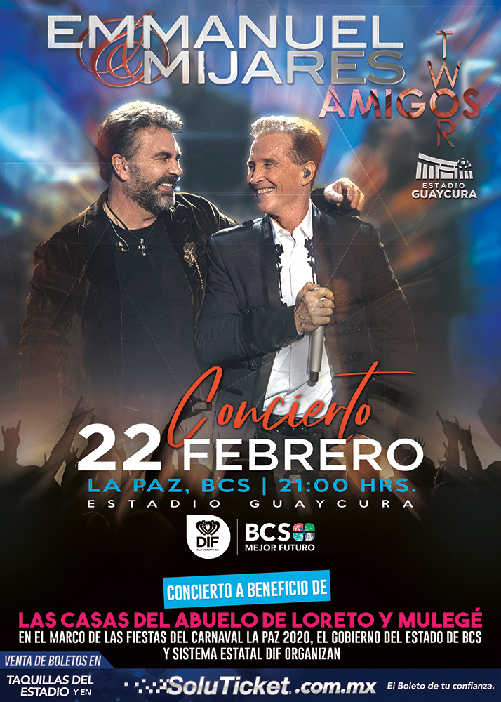 Los boletos para asistir al gran concierto: “Twor Amigos”, de Emmanuel y Mijares, ya se encuentran disponibles para compra en línea, a través del sitio soluticket.com.mx y en taquillas del Estadio Guaycura, a partir del martes 21; aseguró la Directora General del Sistema Estatal DIF, María Cristina Herrera Infante.