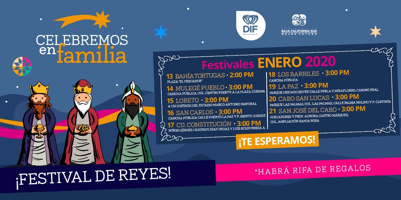 Con la finalidad de incentivar la convivencia de las familias sudcalifornianas, la Presidenta del Sistema Estatal para el Desarrollo Integral de la Familia (SEDIF), Gabriela Velázquez de Mendoza; dio a conocer las fechas de los festivales del “Día de Reyes”, que se estarán realizando durante el mes de enero, por los cinco municipios de la Entidad.