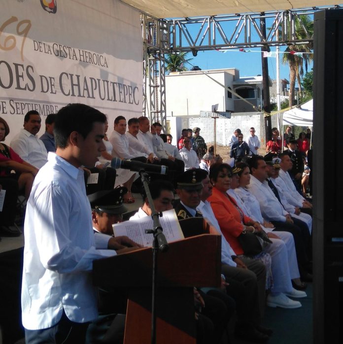 Como Orador Oficial, del acto conmemorativo del CLXIX Aniversario de la Gesta Heroica de los Niños Héroes de Chapultepec. Evento presidido por el gobernador del estado, Carlos Mendoza Davis; dijo que ese compromiso asumido y cumplido por la actual administración, debe complementarse con la intervención activa de las y los jóvenes sudcalifornianos, en la ejecución de las políticas públicas.